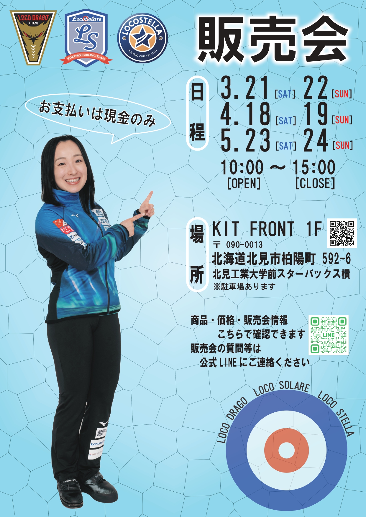 2026.3.6ロコ・ソラーレ様3月・4月・5月 販売会のお知らせ3月21日(土)・3月22日(日)4月18日(土)・4月19日(日)5月23日(土)・5月24日(日)AM10:00~PM15:00までKIT FRONTスターバックスコーヒー様、隣の会場にて販売会を行います。カーリング用品を始め、ロコ・ソラーレ様公式グッズも販売しておりますのでぜひ、お越しください!*お支払いは現金のみとなっております。
